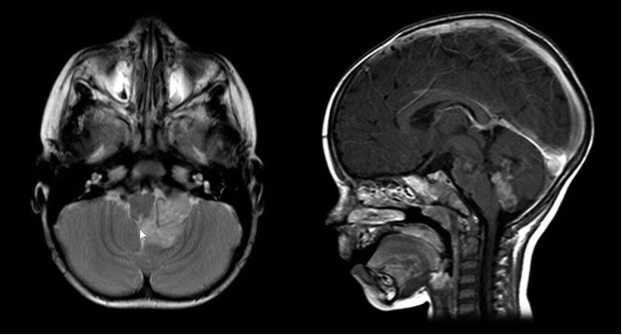 El estudio inicial para el diagnóstico de estos tumores es la resonancia magnética cerebral con gadolinio o medio de contraste. En este estudio, normalmente se identifica un tumor en el interior del cuarto ventrículo, que se origina en su piso. Por su parte, los tumores que se encuentran en el interior de la médula espinal suelen ser extensos a nivel del canal medular.